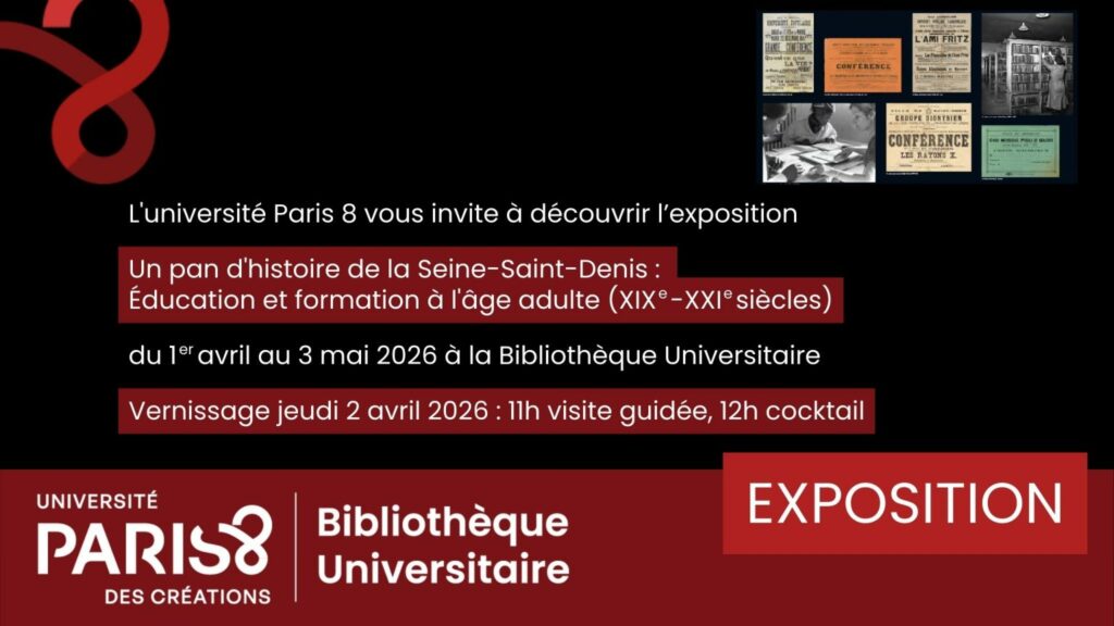 « Nous recommandons la visite de l’exposition du groupe SAFO-93, animé par Françoise Laot et Anna Cathan, et dont l’AHMO-93 était partie prenante, dans la très belle et accueillante bibliothèque de l’Université Paris 8 à Saint-Denis. Cette exposition, intitulée « Un pan d’histoire de la Seine-Saint-Denis : éducation et formation à l’âge adulte, XIXe-XXIe siècles« , a déjà tourné dans notre département à la maison des Sciences de l’Homme du Campus Condorcet et aux Archives départementales à Bobigny, et est promise en différents autres lieux.